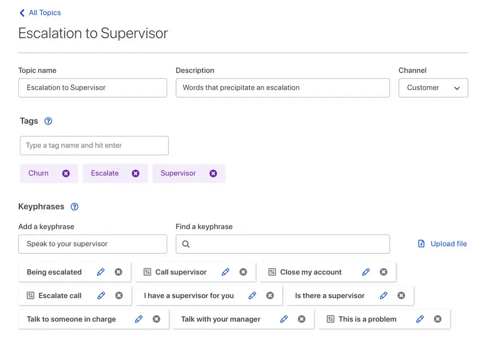 Topics are collections of keywords and phrases relevant to your customer experience strategy. Topics can represent concepts like “politeness” or “ownership” — or key business elements like product names and store locations. Within topics, you assign all the keywords that occur in conversations related to the topics.