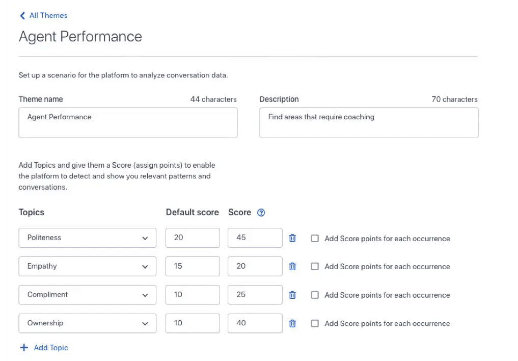 Themes are score-weighted collections of Topics, and you build them into more complex concepts. For example, a theme like Positive Agent Behavior could be built from the Topics “Politeness,” “Proactive Language,” and “Agent Compliments.”